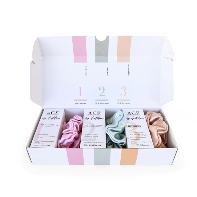 Kit imperdible para quienes quieran incorporar a sus rutinas la trilogía completa de serums ACF by dadatina. El kit incluye los serum VOL.1: BALANCE, VOL.2: RESTAURACIÓN y VOL.3: RENOVACIÓN más 3 scrunchies a juego todo en una delicada caja regalable.